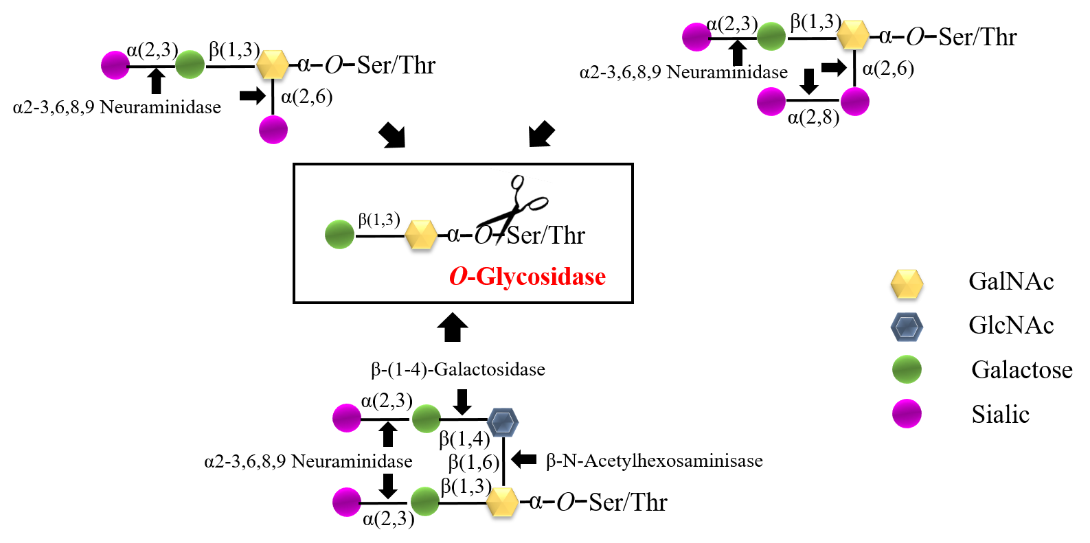2. O-連糖鏈的釋放需要通過(guò)一系列糖苷酶除去單糖,直到將它們修剪成Core 1Gal-GalNAc-O-S / T)或/Core 3GlcNAc-GalNAc-O-S / T)結(jié)構(gòu)