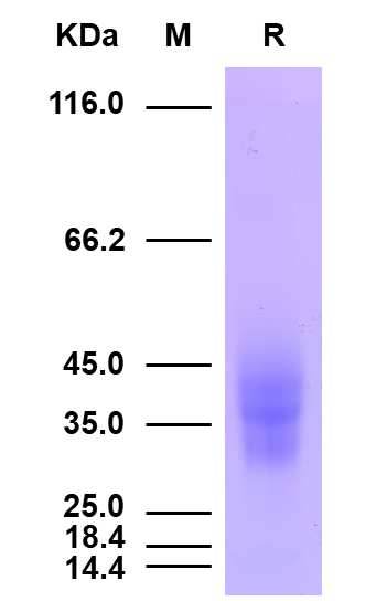理論分子量為29.8kDa,由于糖基化,SDS-PAGE還原電泳分子量大小為40-50kDa。