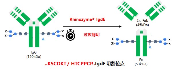 IgdE protease是僅在人IgG1鉸鏈區(qū)上方的一個特定位點裂解以產(chǎn)生Fab和完整Fc片段的免疫球蛋白降解酶。該酶的最適pH值為6.5~7.5,且無需還原環(huán)境或其他輔助因子。由于IgdEprotease僅在人IgG1的特定位點(..KSCDKT / HTCPPCP..)酶切,因此延長孵育時間也沒有過度消化的風(fēng)險。