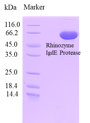 Rhinogen? IgdE protease是利用E. coli表達(dá)系統(tǒng)重組表達(dá)獲得,分子量大小約為70 kDa。