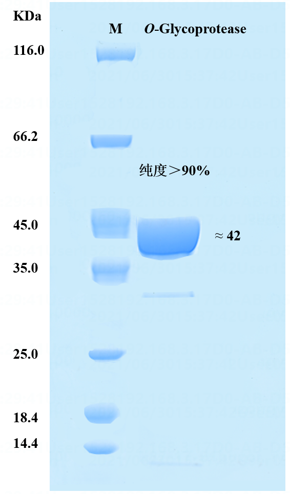 O-糖蛋白酶(O-Glycoprotease)重組表達于E.coli,C端帶6×His標簽。O-糖蛋白酶是一種O-糖蛋白特異性內(nèi)切蛋白酶,可催化天然黏蛋白型O-糖基化蛋白中與O-聚體直接相鄰的肽鍵的水解。