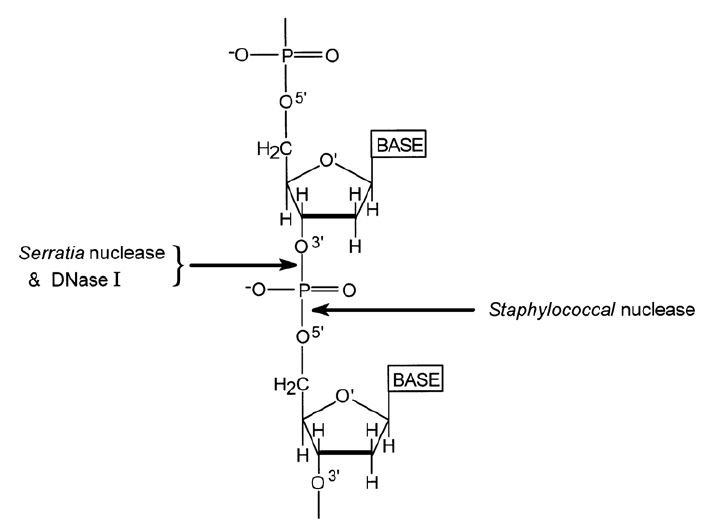 NuclecutTM全能核酸酶(SuperNuclease)是一種核酸內(nèi)切酶,可將核酸降解成2~5個堿基的5'-單磷酸核苷酸,因其能高效降解任何形式(雙鏈,單鏈,線狀,環(huán)狀)的DNARNA而沒有蛋白裂解活性,因此被稱為全能核酸酶。全能核酸酶可以非特異性裂解單鏈以及雙鏈的DNARNA,并切割出一個3'-OH5'-磷酸基(如圖1),主要用于重組蛋白、病毒疫苗、細(xì)胞和基因治療用病毒載體、溶瘤病毒及其它生物制品中DNA/RNA去除。該酶在0~42℃的均有活性,最適溫度為37℃。有效的pH范圍為6.0-10.0,最適pH8.0。發(fā)揮活性需要Mg2+存在,1-2mM為最佳。在去污劑、SDS、尿素等存在下仍然保持一定活性。