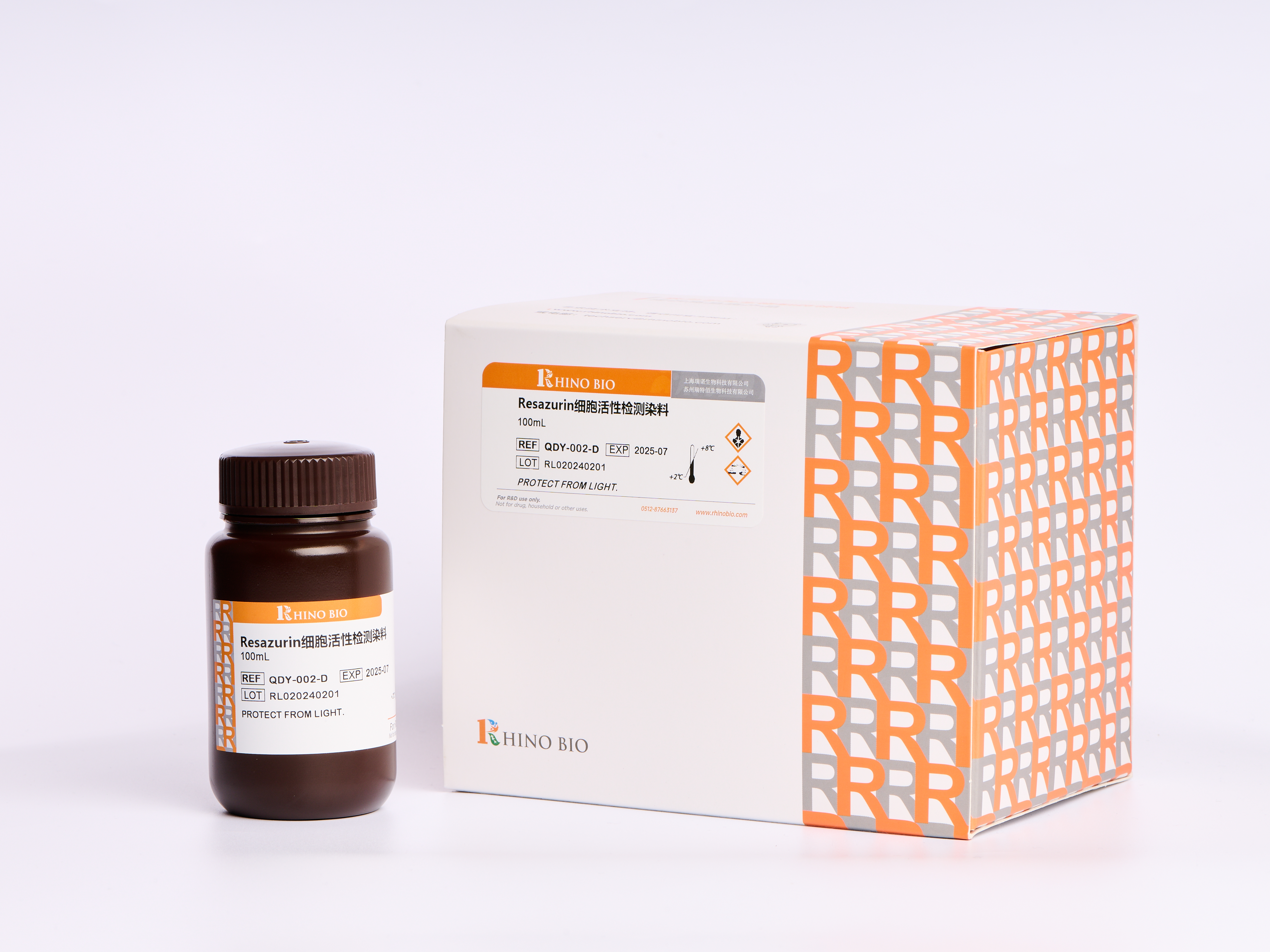 Resazurin細胞熒光染料檢測試劑為細胞增殖和細胞毒性檢測提供了一種簡便、快速、可靠、安全的方法,適用于高通量檢測實驗。該檢測試劑的主要成分是刃天青(resazurin),刃天青呈靛青藍色,在還原條件下可以轉(zhuǎn)化成一種粉紅色熒光終產(chǎn)物試鹵靈(resorufin),其最大吸光度為573nm,熒光為激發(fā)光579nm/發(fā)射光584nm
