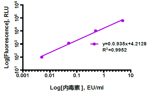 根據(jù) Rhinogen? 重組 C 因子內(nèi)毒素檢測試劑盒的要求,我們設(shè)置了統(tǒng)一的檢測模板(如需模板請關(guān)注RhinoBio公眾號咨詢在線客服)。酶標儀溫度設(shè)置 37℃,分別在 0h 和 1h 進行相對熒光強度檢測,讀值記作 T0 和 T1。所有孔的 ΔRFU=T1-T0,標準品/樣品凈 ΔRFU= 標準品/樣品 ΔRFU- 陰性對照 ΔRFU。以內(nèi)毒素工作標準品溶液濃度為橫坐標,凈 ΔRFU 為縱坐標繪圖并進行 Log-Log 擬合,log(ΔRFU) = A*log(內(nèi)毒素濃度 EU/ml)+B。